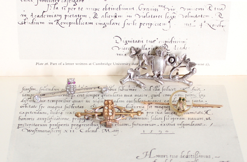 一目でそれとわかる、角帽に眼鏡という梟も デザインによっては可愛らしいが、 例えば、資格試験や研究など、 社会人になってからも勉学に励んでいるひとへ贈るブローチなら、 ジュエリーの要素が強い雰囲気の品のほうが、 周りにお守りだと気づかれることもなく、 さりげなく身につけて楽しんでもらえるのではないだろうか。 そんなイメージで、今月の4品を選んでみた。