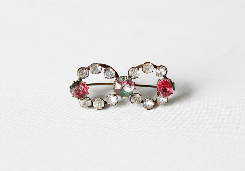 表からはリボンのような形に見えるが 裏から見ると、二つの輪が中央のアイリスガラスで つながれているのが分かる。 ジュエリーのデザインにおいて、多くの場合 輪は「永遠」を暗示している。