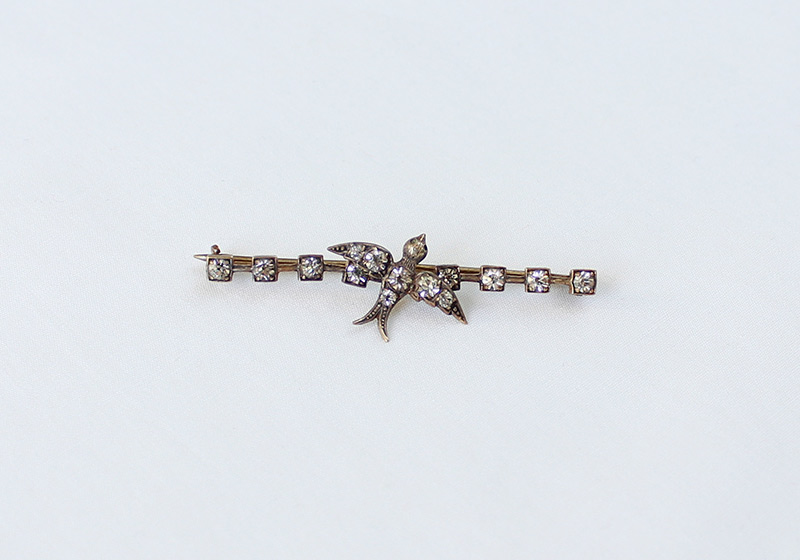 ペーストは、当時の 銀製や真鍮製の燕のブローチによく使われていた。 ダイヤモンドやゴールドなど、 高価な素材があしらわれた品も作られていたが これはカジュアルに楽しめる可愛らしい一品だ。