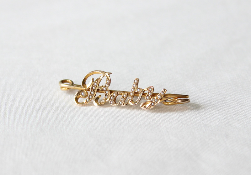 Babyという文字をかたどったブローチは ヴィクトリア時代にとても流行し、 とりわけ子どもの洗礼のお祝いにプレゼント されることが多かったそうだ。