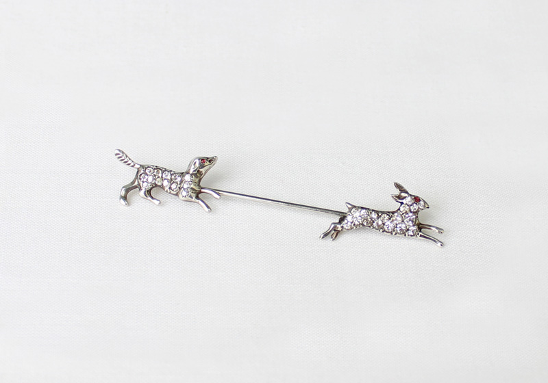 1920年〜1930年にかけて流行したジュエリーで、当品は 野うさぎを追いかける狩猟犬、といった物語性のあるデザイン。 それぞれ、体と目にあしらわれているのは ダイヤモンドとルビーを模したペースト(カットガラス)。