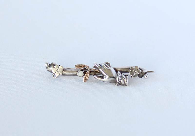 mistletoe(ミスルトー)と呼ばれるヤドリギ、 それを持つ手の左右に、忘れな草が ひとつずつ配置されたアンティーク・ブローチ。