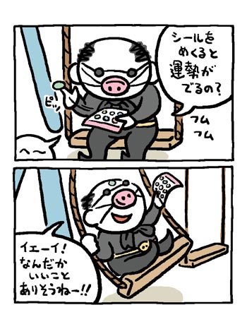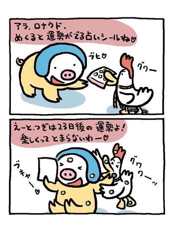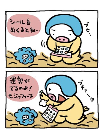 | あそびかたは、かんたん。 まず「知りたいこと」を念じて、 シールをじっと見ます。 睨まなくってもいいですけど、 それなりに真剣に念じるといいかも。 (これはマーコさんの「辞書占い」がヒントです。) 念じましたか? そしたら、 「これだ!」と思うブタフィーヌさんを 直感で、えいやっとめくってください。 そうすると、そこには、 ブタフィーヌさんからのメッセージが‥‥! |