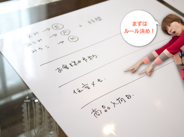 と、そのまえに。まずはじめに、ルールを決めましょう! このカレンダーを見て情報を共有するメンバーを書き出して。 このメンバーで、共有する必要がある項目は何か、書き出します。 ・お客様の予約 ・伝言メモ ・商品入荷日