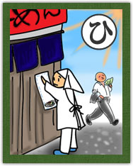 お店の人が「はじめました」の紙を店先に貼ってます。