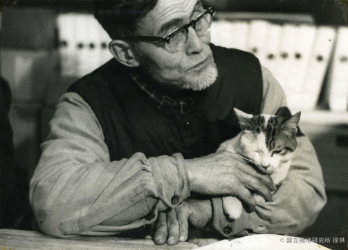 ▲西堀越冬隊長の腕に抱かれるタケシ。