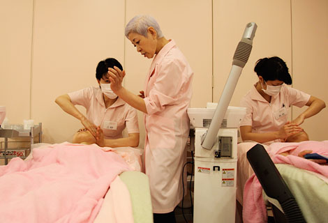 | 佐伯 | はい。クリームを使って、手で しっかりとマッサージします。 手の温もりでリフティングできるんですか、と よく訊かれますけれども、 手ほどいい道具はないんですよ。 密着もきく、 角度もお顔に合わせて微妙に変えられる、 保冷剤で手を冷やしながらマッサージすると 温度差も利用することができます。 施術のあと、 「あ、上がってる!」 「ほうれい線なくなってる!」 「顔がちっちゃくなってる!」と、 みなさん鏡を見て喜ばれます。 |