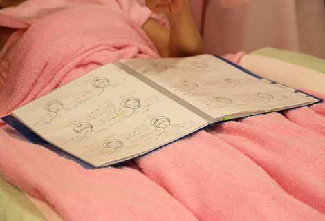 | 佐伯 | そうですね。 基本的なところだけは、 はじめのカウンセリングでうかがいます。 「強めがお好みです」 「波の音はお嫌いです」 西洋人の方は 暗い部屋がお嫌いなことがありますし、 2時間半じっとしていられない人もいます。 そういうことを スタッフみんなで共有できるようにしています。 うちは、担当制度をとっていないので、 技術者が替わるたびに 説明しなくてはいけないなんて、 腹立ちますでしょ? |