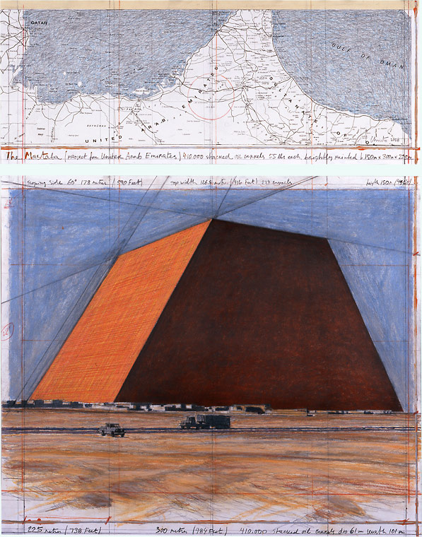 | クリスト | コロラドの「オーバー・ザ・リバー」と アブダビ砂漠に 41万個のドラム缶を積み上げてつくる 「マスタバ」です。 後者は、1977年から取り組んでいます。 |