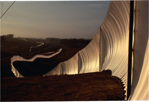 | クリスト | プロジェクトによって、制約がありますから。 つまり、北カリフォルニアの牧場や農場に およそ40キロに渡って 高さ5.5メートルのナイロン製フェンスを建てた 「ランニング・フェンス」や‥‥。 |