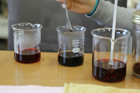 | 小川 | もちろんです。 まずログウッドですね。 ログウッドじゃないと、 こういう深いネイビーや、 濃いブラックは出ないんです。 |