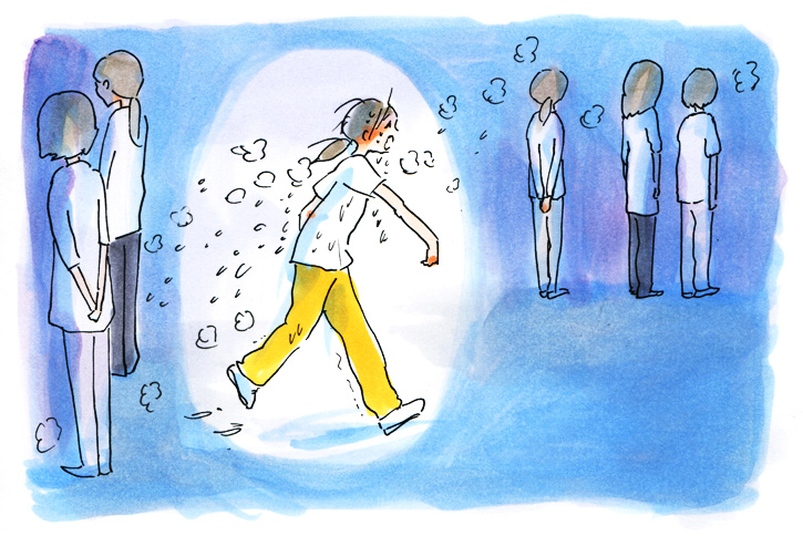 稽古はだんだんとシーンが固まってきました。 最前線を逃げ惑うシーンでは、 会話はなく、ひたすら役者さんが縦横に走り回ります。 一番若い役者の長谷川洋子さんは大学1年生。 去年まで、『cocoon』の少女達と同じ女子高生でした。 彼女がひとりで走り回るシーンは、 ただただ、恐ろしかったです。 稽古場に彼女のゼエゼエという息切れだけが響く。 それでも走るのをやめることはできず、 息切れに混じって、ひいっと叫び声のようなものが漏れてくる。 本当に死んでしまうのではないか、と思いました。 こわくてこわくて、悲しくないのに、涙が浮かんできました。