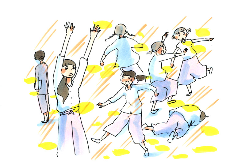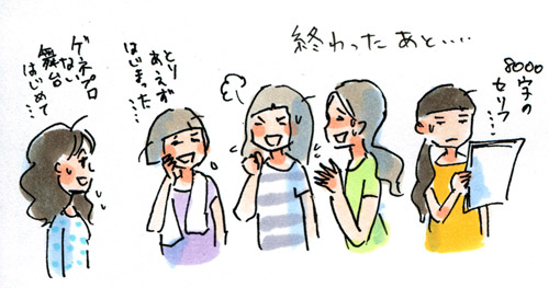 大きな拍手をいただいた初回でしたが、 関係者にとってはハラハラの連続でした。 前日夜までの稽古を見学した限りでは、 まだ完成にはほど遠い状態。 胃が痛くなりながら、 しかし原作者としては見守るしか無い歯がゆさに 一晩中耐えました。 去年の共作「マームと誰かさん」の舞台でも、 本番ギリギリまで未完成だったことを思い出しつつ、 さすがに今回は大きな劇場だし、 役者さんも多いし大丈夫。と思っていたのですが。 やっぱり当日になっても 完成していなかったのです!!(ぎゃ!) 心配で稽古をみていられなくなってしまい、 開演ギリギリに顔を出すと、 制作の林さんから 「さっきできたんです」と耳打ちされました。 主人公・サンを演じる青柳いづみさんは 当日朝に8000字の台詞を渡されたとか。 それを覚えて完璧に演じられるのはさすがですが、 役者さんたちや対応するスタッフは本当に大変でしょう。 幕が上がるまで、 限界まで粘って良い作品を作ろうという気持ちは もちろんわかる、けど、ギリギリすぎじゃないの?!