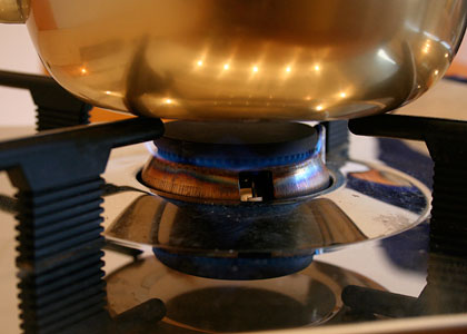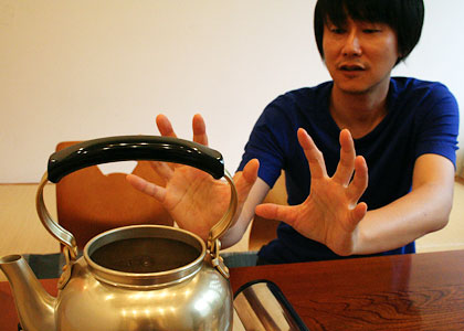 | 弱火なので沸騰するまで時間がかかりますが‥‥。 福田さん、きょうはどんなカップで飲みます? |