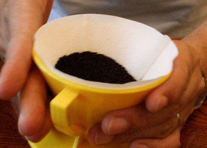 | はい、そうしています。 これをば、セットしておいたドリッパーに ザザッと入れまして‥‥。 |