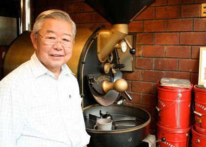 ![]() 店主の元木茂さんと焙煎マシン。 |
