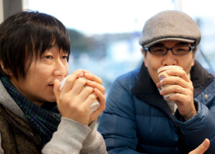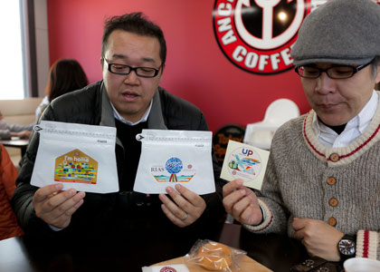 | ともあれ、 こうしてできあがったデザインサンプルを手に、 ぼくと福田さんは、 気仙沼のアンカーコーヒーをたずねました。 |