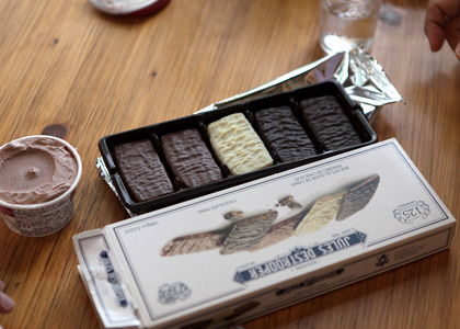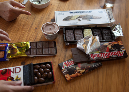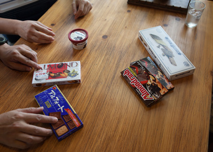 | 栗原さんとぼくは、 持ってきたふたつのチョコが似てますよね。 ナッツ系と、ビスケット&チョコ系。 |