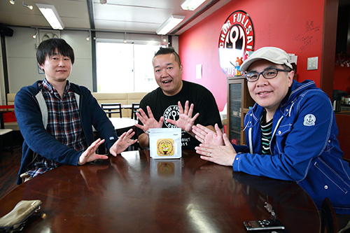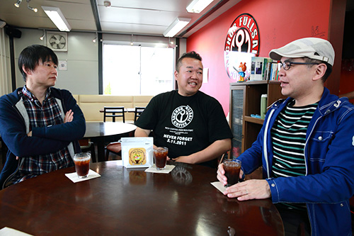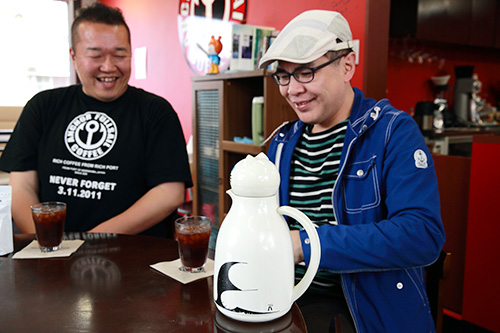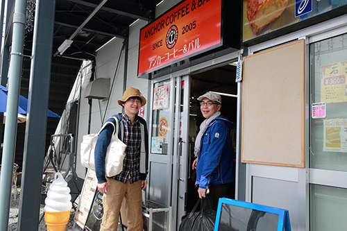 「ごめんくださーい」と入店するわれわれを 出迎えてくださったのは、 おなじみ、「やっちさん」こと、 アンカーコーヒーの小野寺靖忠さんです。 完成したパッケージといっしょに、ぱちり。 |