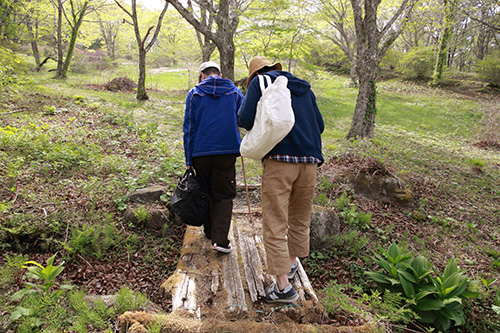 有名な「吊り橋効果」で友情をぐーっと深めながら、 5分ほど歩いたでしょうか。 ぱっと視界がひらける場所に出て‥‥ |