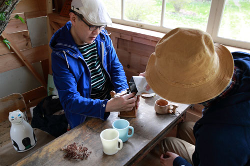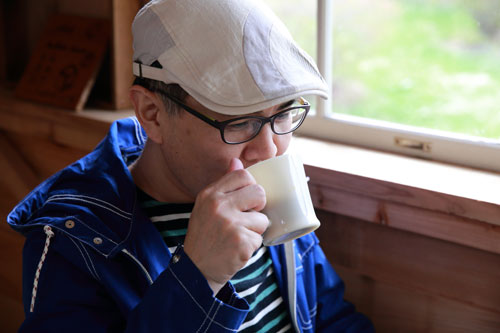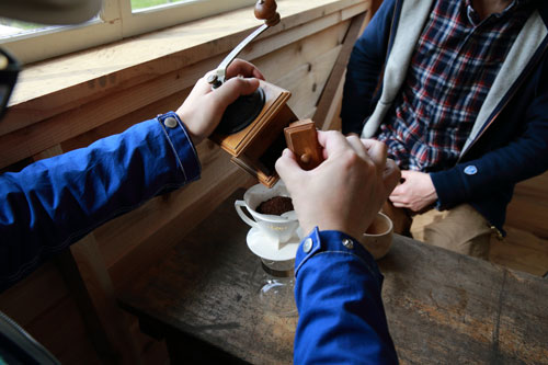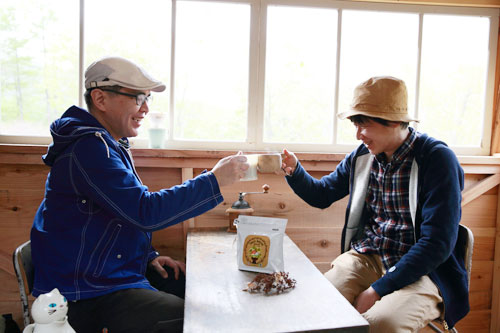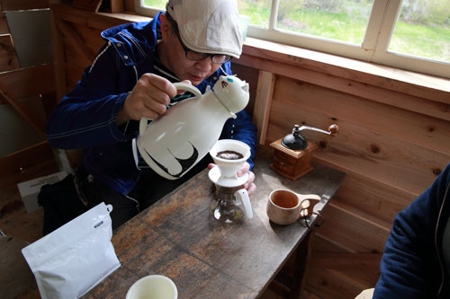 | それが木の香りと混ざって、最高です。 ‥‥さあ、コーヒーがはいりました。 (それぞれのカップにそそぐ) |