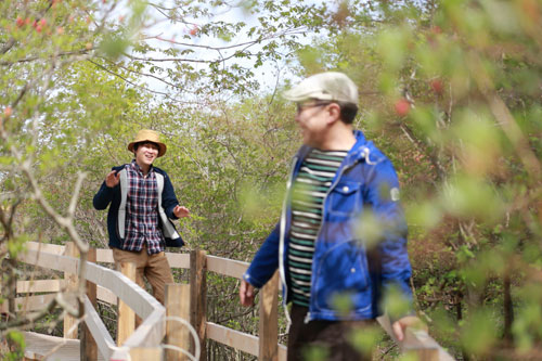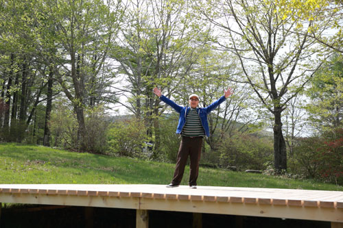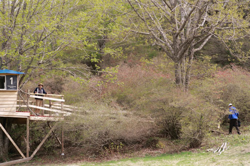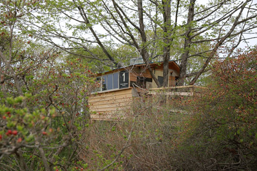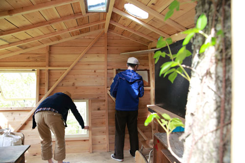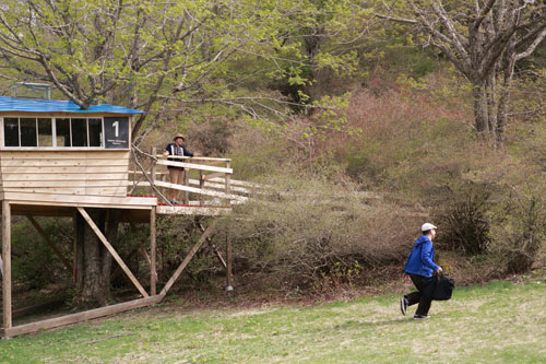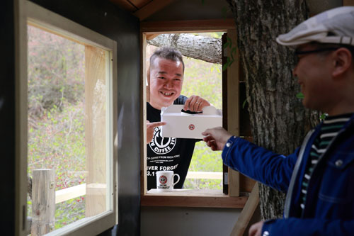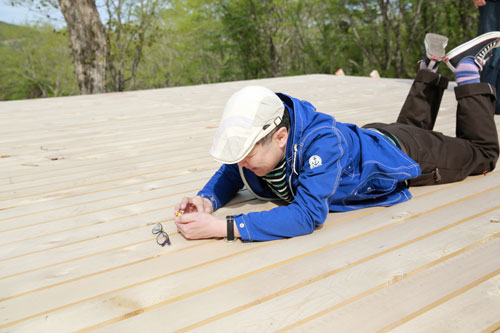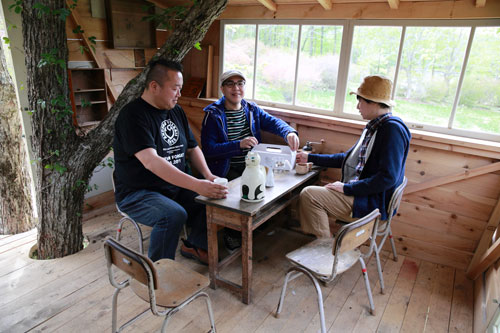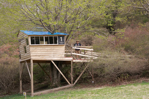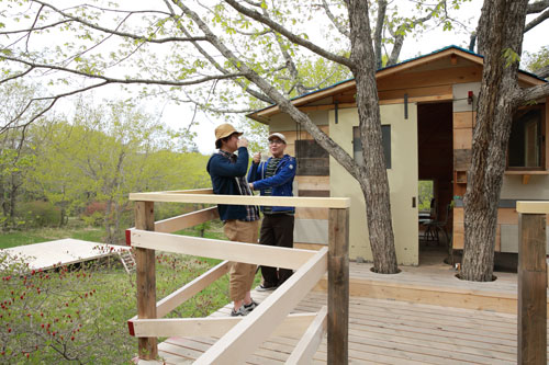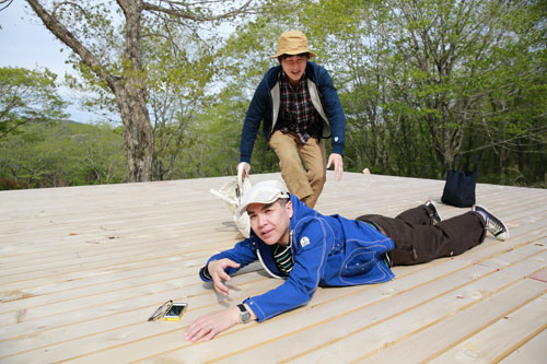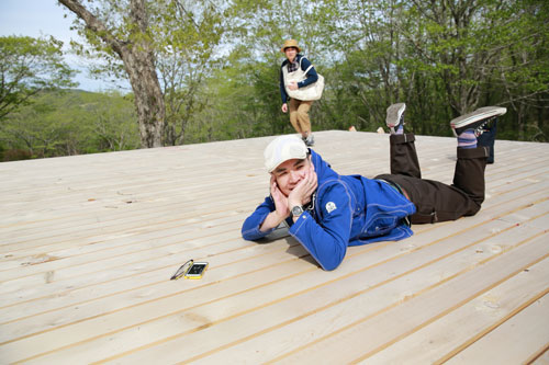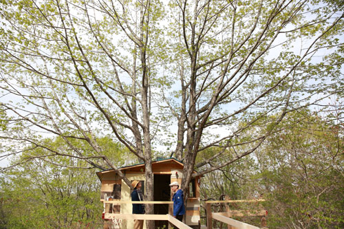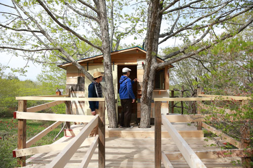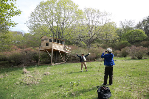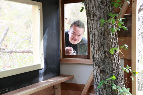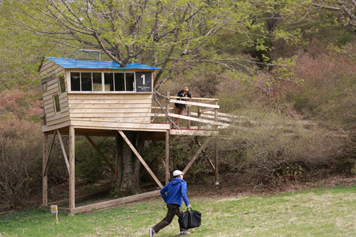 | じゃあ、福田さん、 ツリーハウス1号を背景に写真を撮りまーす。 |