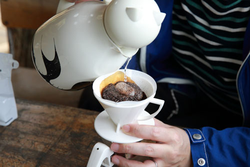 | おおー、うまいこと細くお湯が出ますね。 いいですね、そのポット、かわいいし。 |