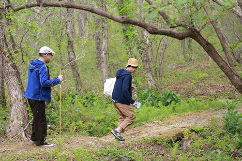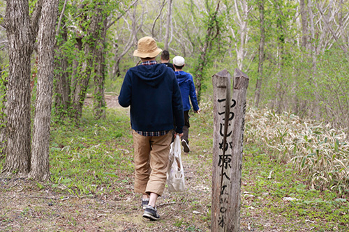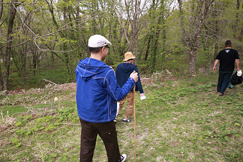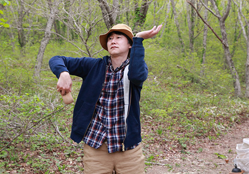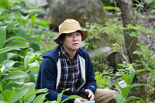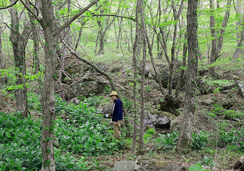| (ふと足をとめる) あ、なんか湿った場所がある。 小川が流れてる場所がある。 すごく湿った感じがしている。 福田さん、あのあたりカッパが似合う雰囲気なので、 ちょっとあそこに行ってみてください。 |
