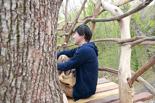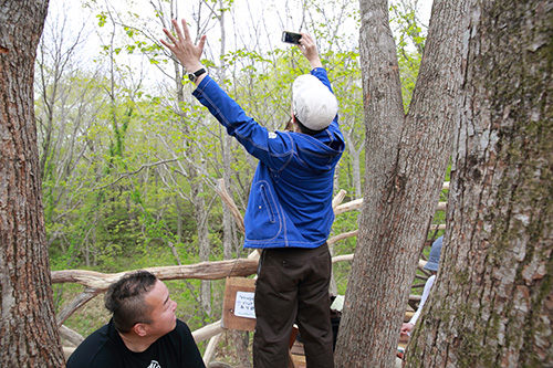 | ‥‥よし。 ツリーハウスの上にいるところを写真にとって、 糸井さんに送ろうっと。 (自分撮りをする) |