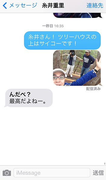 | iPhoneのメッセージで‥‥ 「糸井さん! ツリーハウスの 上はサイコーです!」 と書いて‥‥送信!(ポチ) ‥‥よし、と。 どうやら送れたみたいです。 |