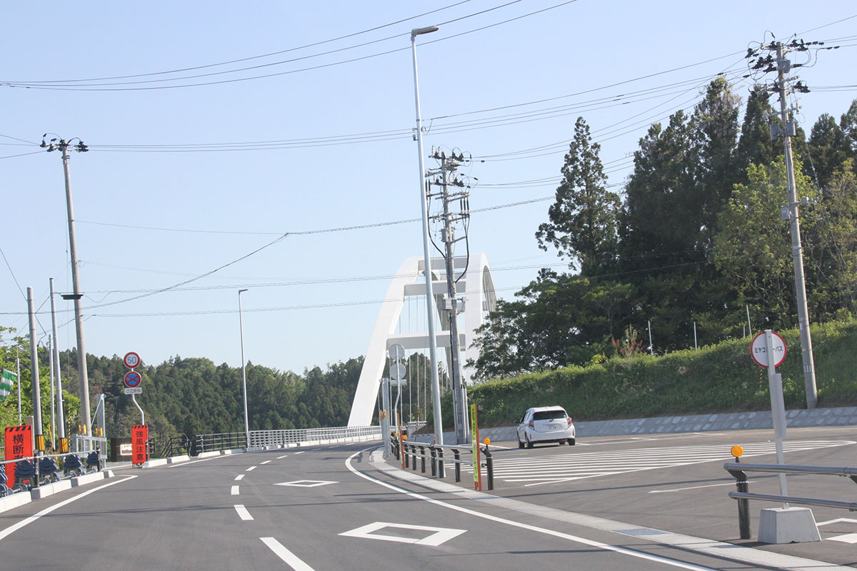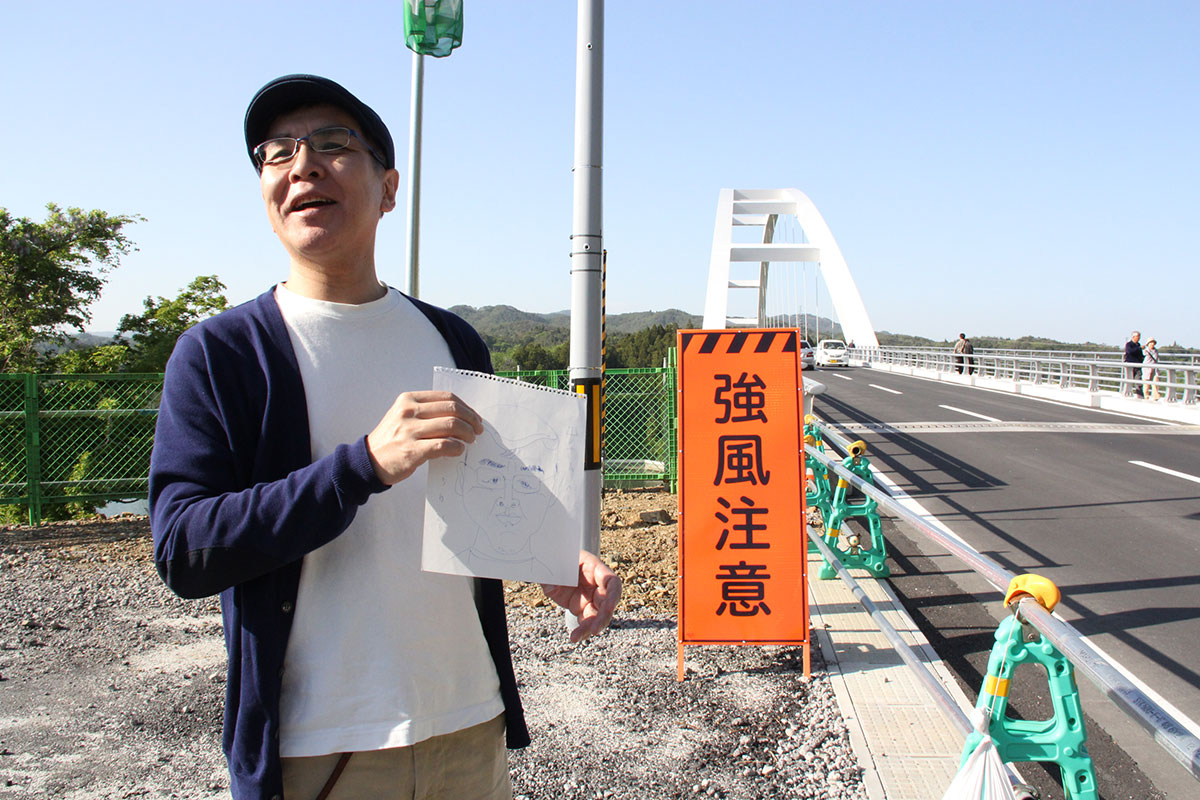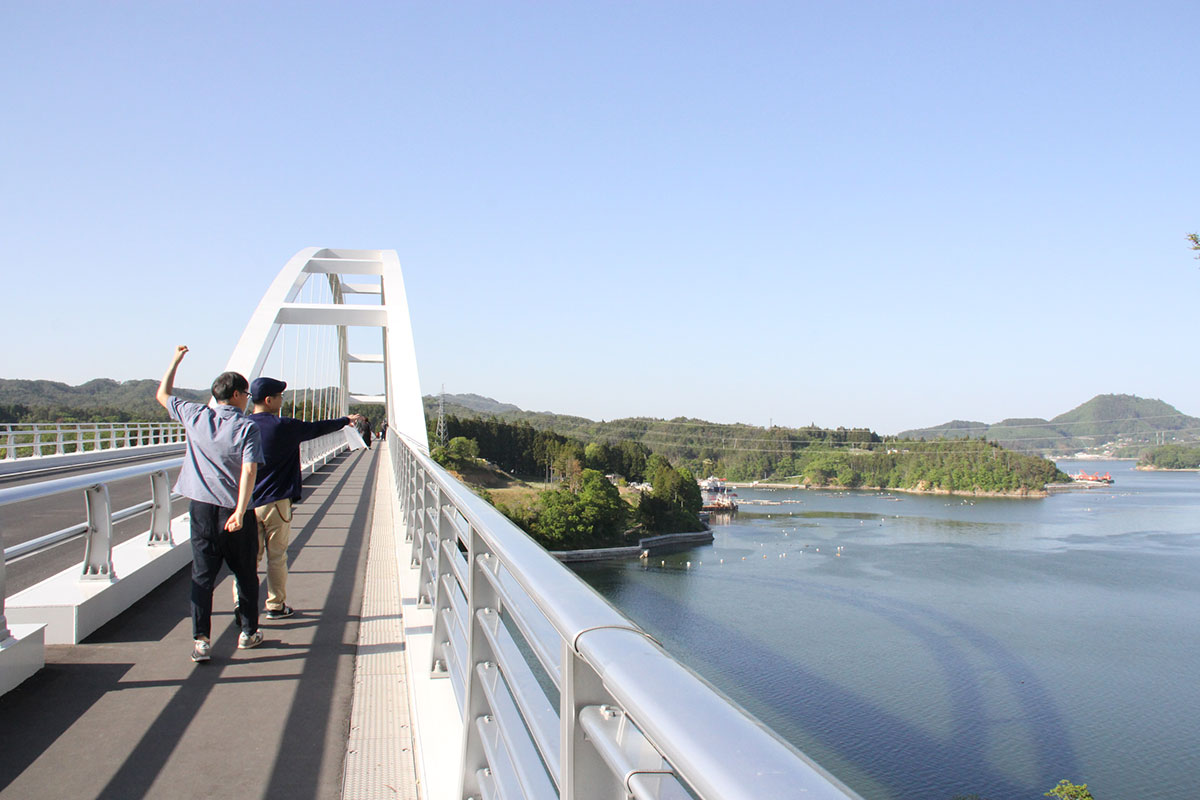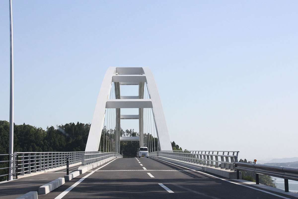 | 「アンカーコーヒー内湾店」をあとにした カッパとウサギはサユミちゃんの運転で、 「大島」を目指しています。 気仙沼湾内に位置する「大島」は、 東北最大級の有人離島。 うつくしい自然に囲まれたこの島には、 3000人ほどの人々が暮らしています。 快晴。 海からの風も心地よく。 しばらくドライブをたのしんだところで、 大きな橋が見えてきました。 |