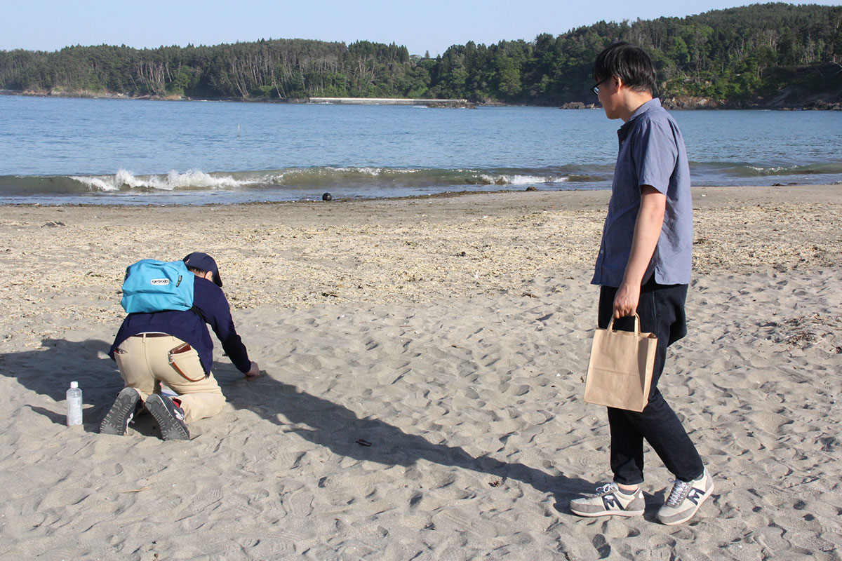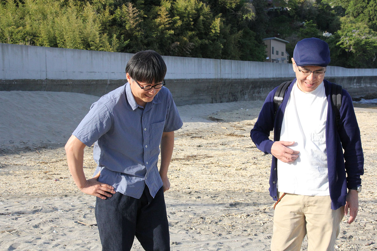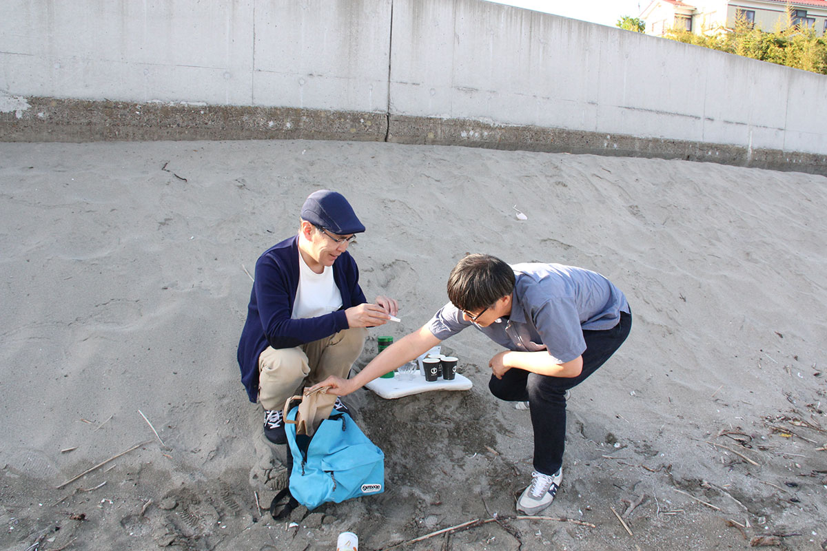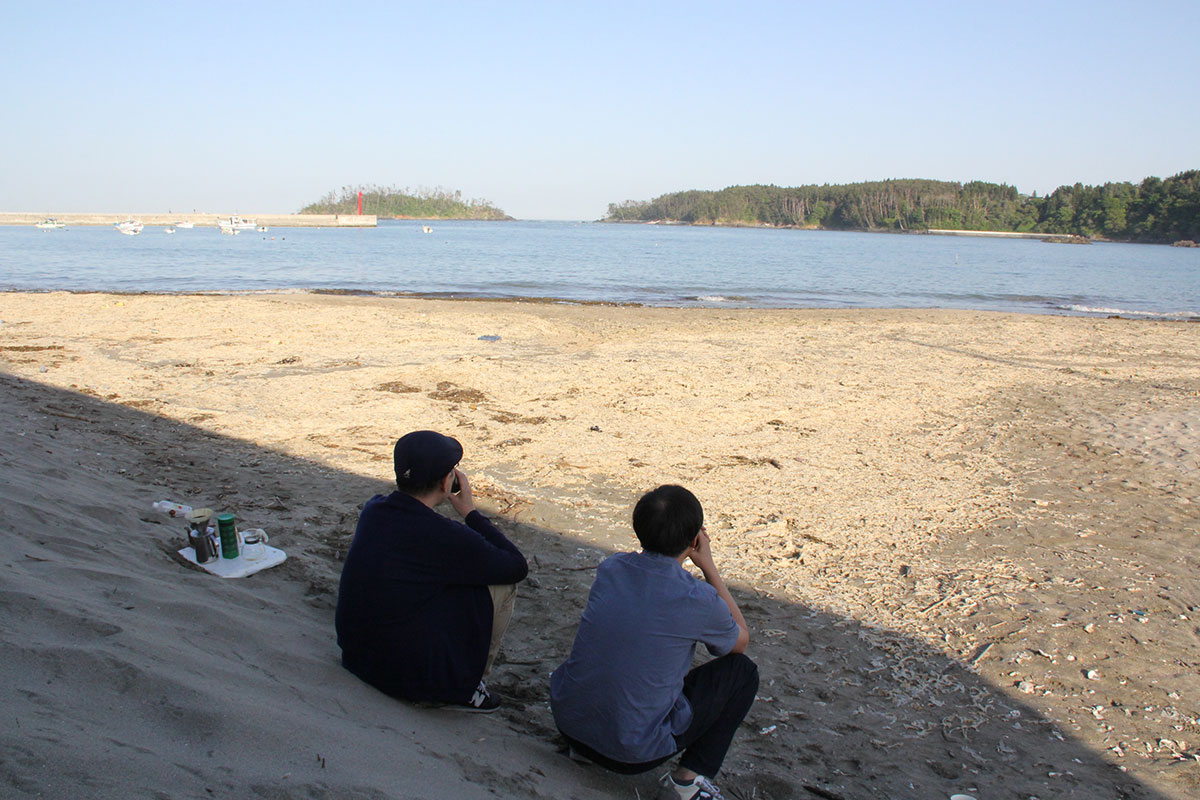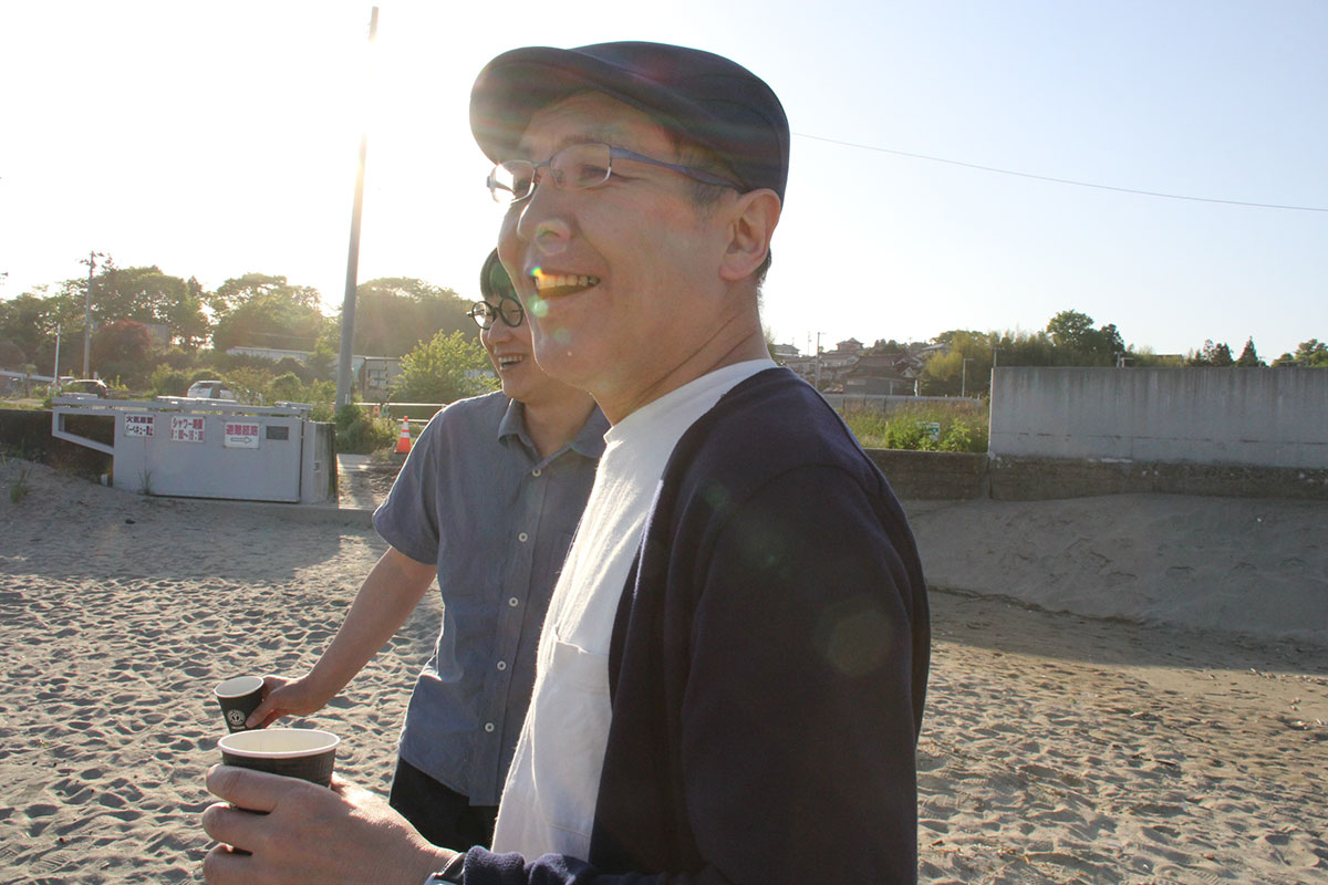 ![]() (西に傾きはじめた5月の太陽が、 男ふたりを生ぬるく照らしています。 ふたりの男はホヤぼーやを海に返し、 コーヒーの道具を片付け、 「大島ビーチ・サンドギャラリー」の作品を撤収しました) |