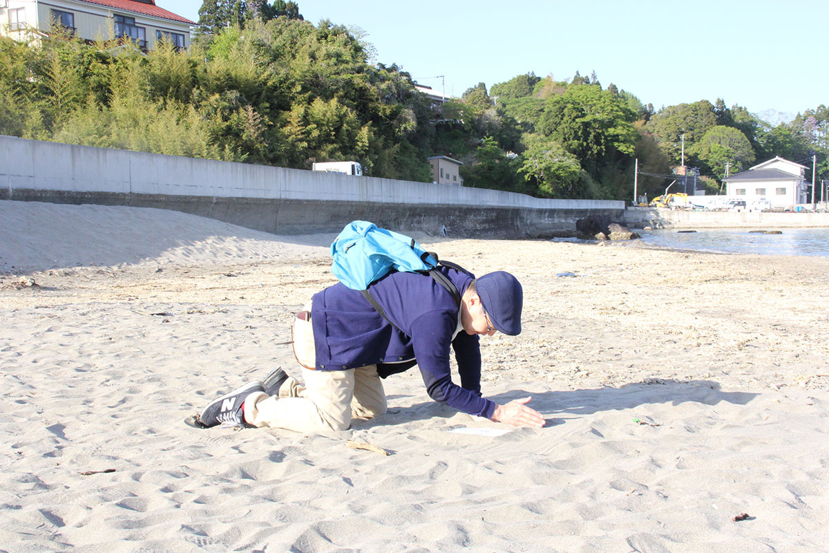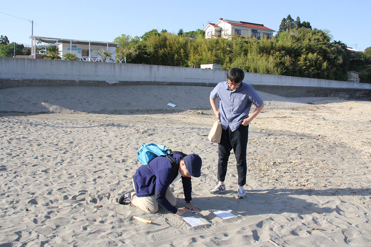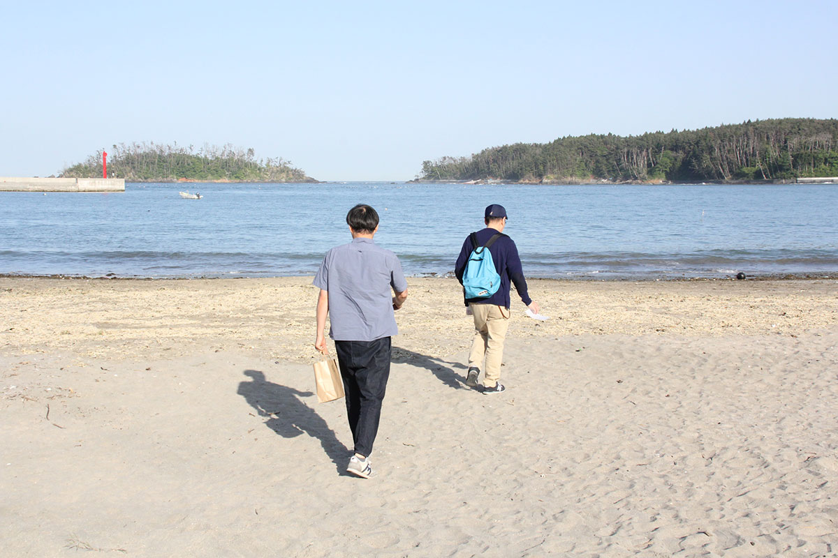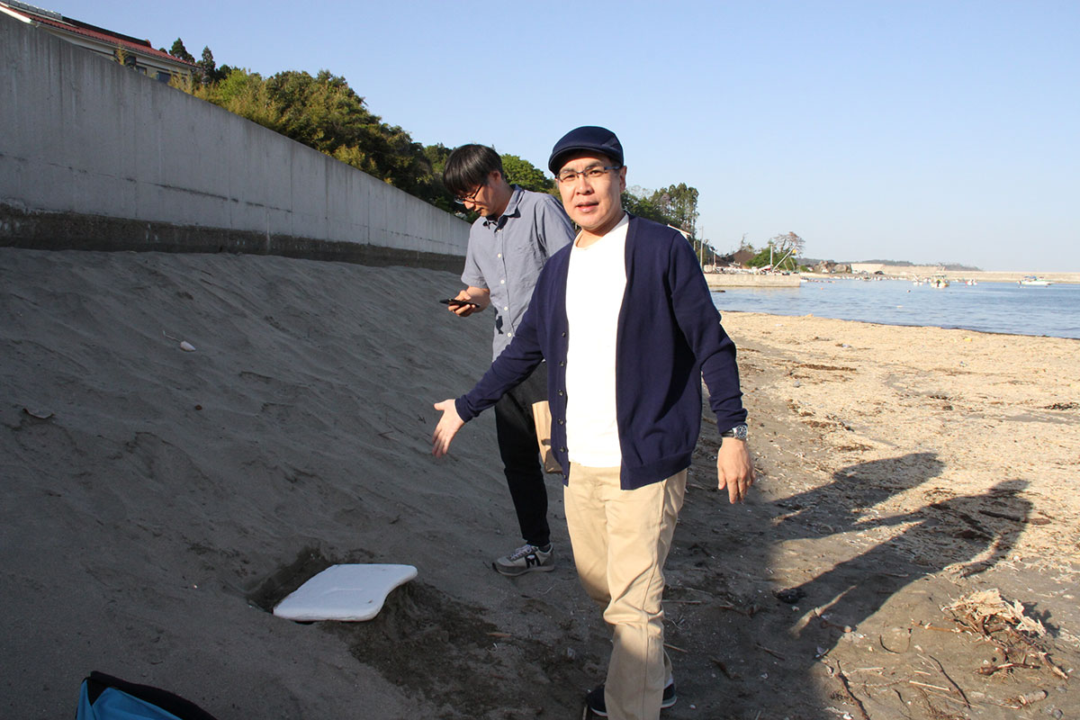 ![]() (西に傾きはじめた5月の太陽が、 男ふたりを生ぬるく照らしています。 ふたりの男はホヤぼーやを海に返し、 コーヒーの道具を片付け、 「大島ビーチ・サンドギャラリー」の作品を撤収しました) |