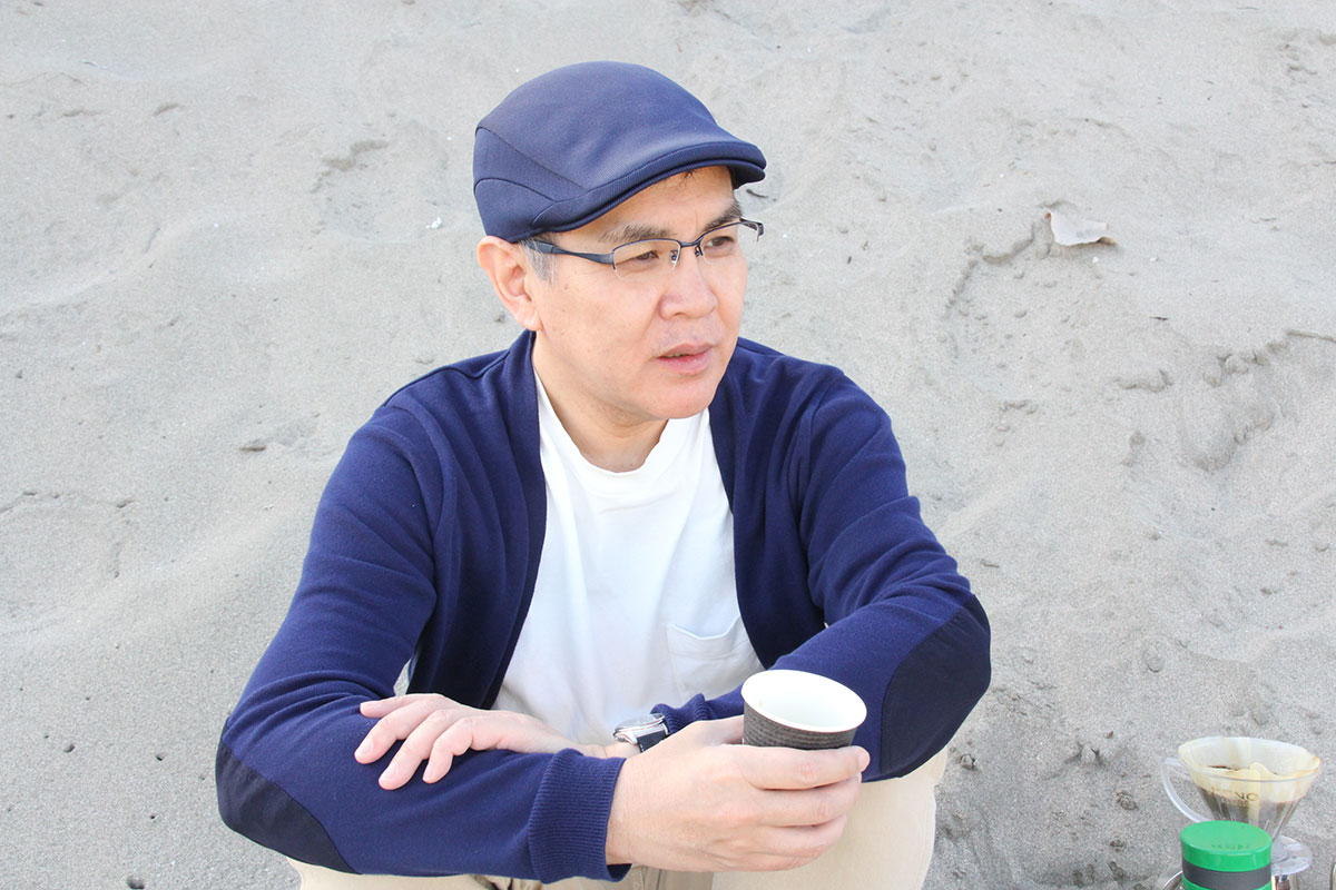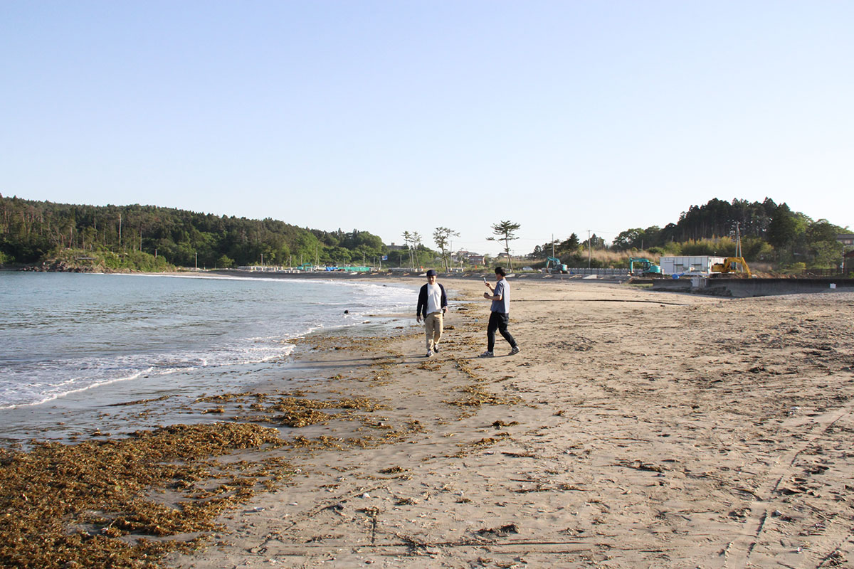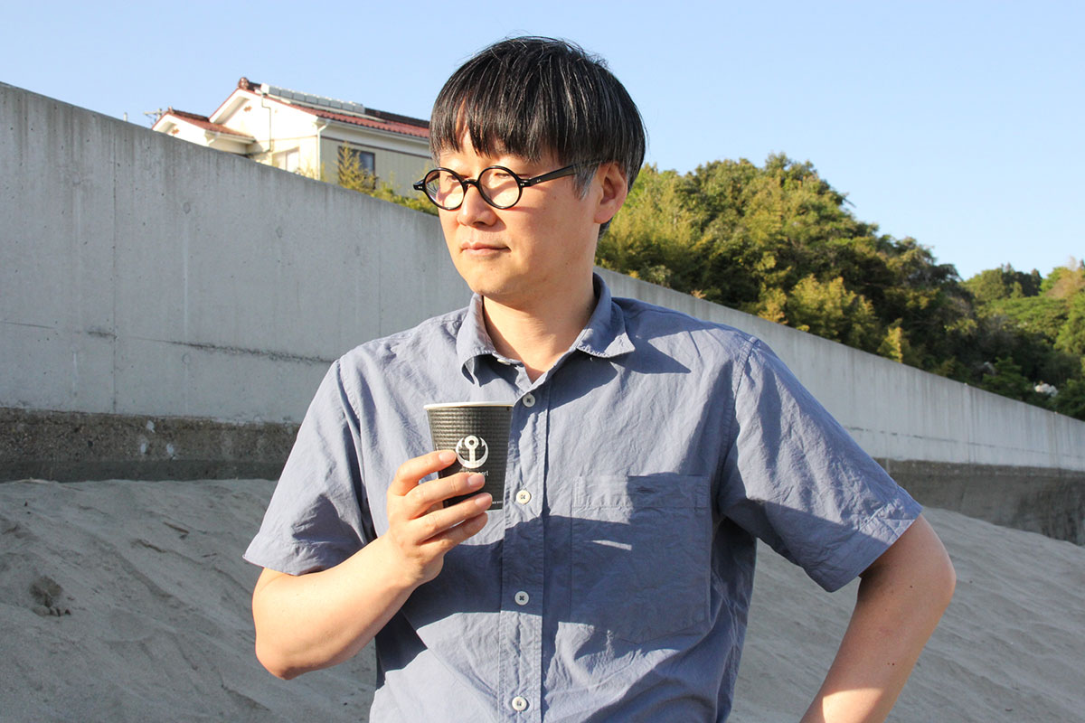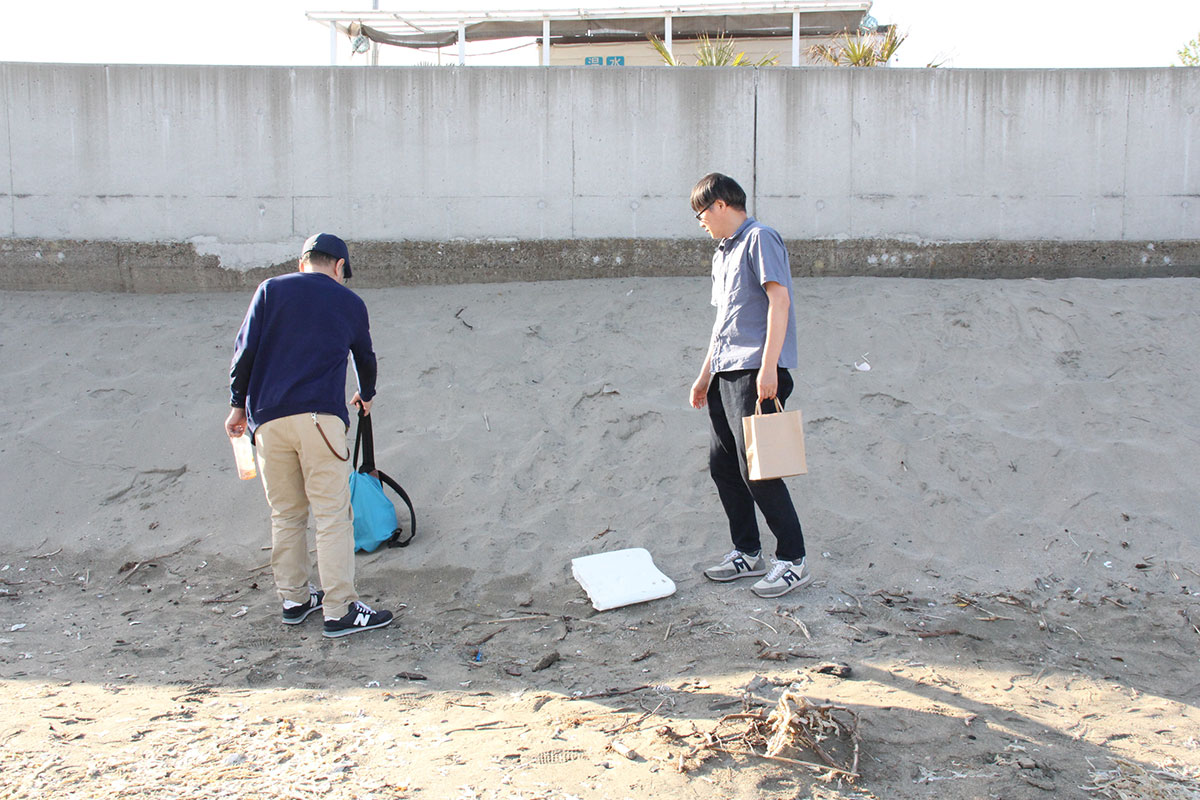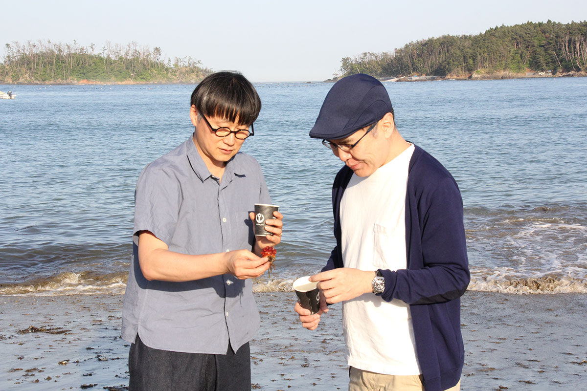 ![]() (西に傾きはじめた5月の太陽が、 男ふたりを生ぬるく照らしています。 ふたりの男はホヤぼーやを海に返し、 コーヒーの道具を片付け、 「大島ビーチ・サンドギャラリー」の作品を撤収しました) |