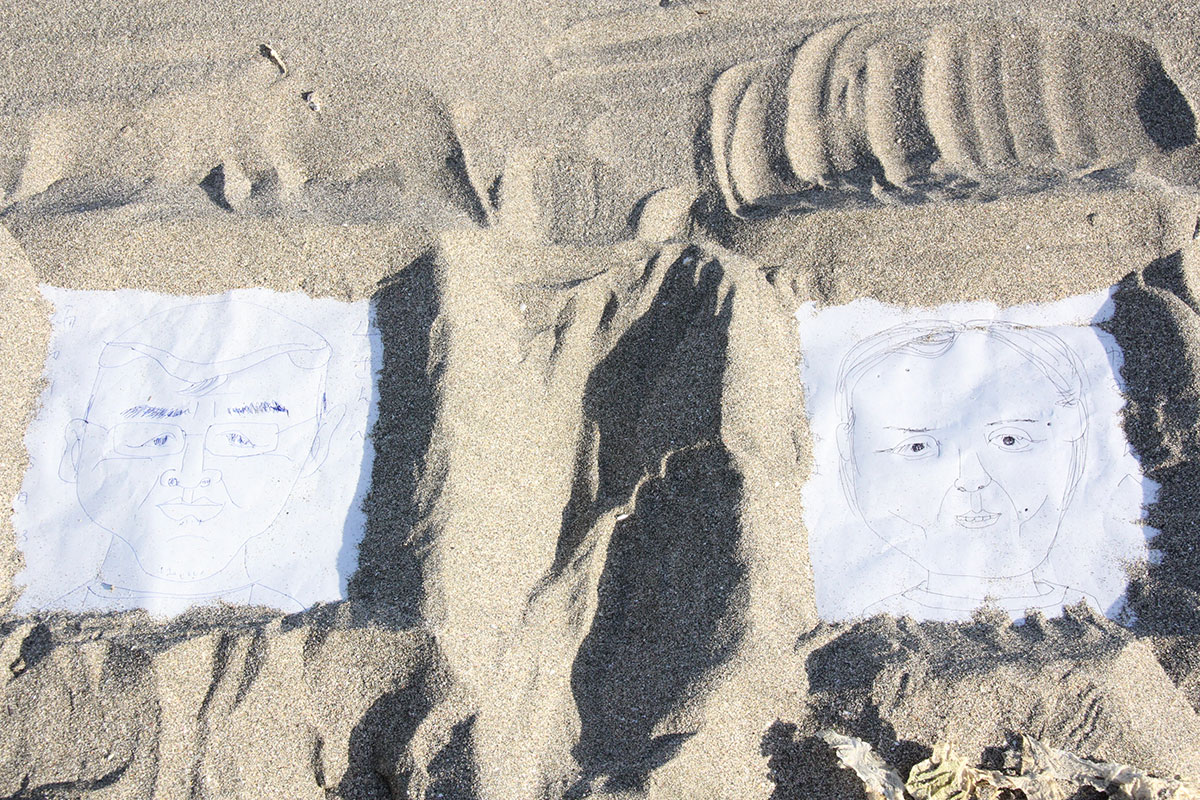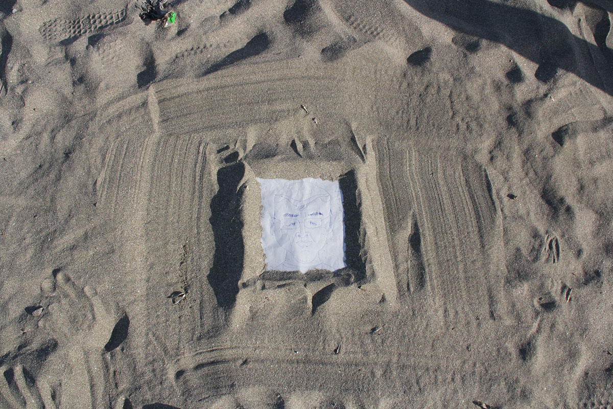 | 福田さんに描いてもらった似顔絵作品を、 こうやってですね、 砂でつくった額縁に‥‥。 |