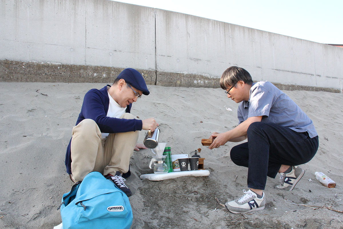 ![]() (外でコーヒーを淹れる作業についてはこのふたり、 なかなか手慣れたものがあります。 福田さんがゴリゴリと豆を挽き、 アンカーコーヒーでポットに入れてもらったお湯を 山下がぽたぽたと注いでいきました) |