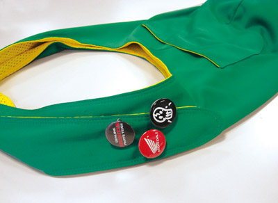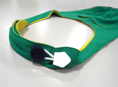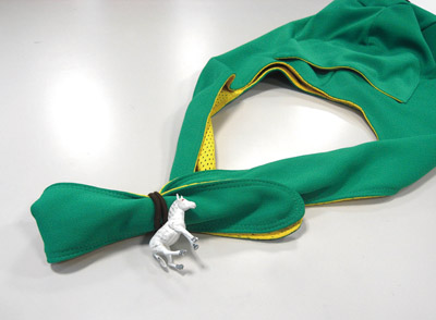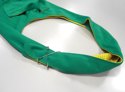 目的の長さに調節したのち、缶バッジの針で留める方法。