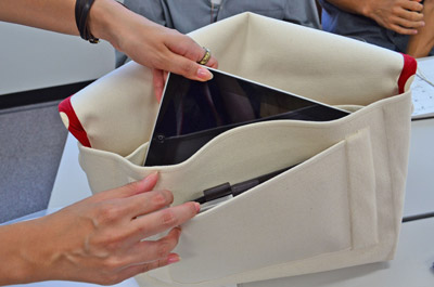 iPadやほぼ日手帳が収まるポケットもついてます。 |