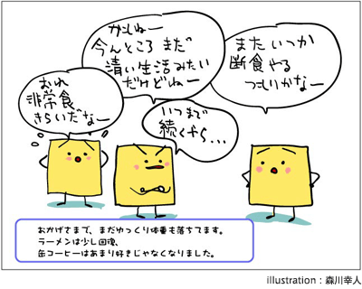 | うーん、どうでしょう‥‥。 担当してくれた先生は、 断食を何度も繰り返すのはまちがいだって 言ってるんですよ。 なぜなら「断食でリセットすればいいじゃん」 っていう発想になっちゃうから。 |