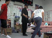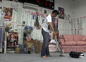 13:22 | まずはストレッチから。 ボールのついた棒みたいなもので、 脚、背中と、しごいていきます。 すでにケビンさんはトレーナーモード。 このストレッチ方法の効能などを 力説されてます。 どこでやろうが関係ない!って感じ。 |