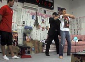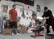 13:33 | バーベルなしでスクワット運動。 ケビンさんが後ろから、 重さをかけます。 これを3セット。 darlingの様子見ると、かなりハードみたい。 |