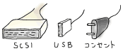 SCSI 【Small Computer System Interface】 読み:スカジー パソコンに周辺機器を増設する差込口(電気で云うと コンセント)の種類のひとつ。 SCSIには、スキャナ、CD/CD-Rドライブ、ハードディスク、 MOドライブなどを接続できます。 最近はUSBという差し込み口が主流で、 ほとんどの周辺装置がUSB接続できるため、 わざわざSCSIを使うことは減りました。 (koh) 「友達からスキャナ借りてきたんだけど、 線が合わないんだ」 「どれどれ?ああ、これSCSIのスキャナだから、 USBにはつなげないよ」 (koh) ![]() 最初からパソコンに付いていることは少ないので、 使うときは、ほとんどの場合、 板チョコレート大の 「SCSIカード」と云うものをパソコンの内部に増やします。 (koh) 数珠繋ぎにして、最後にターミネーターと呼ばれる、 「これ以上機器はありません」という合図のための装置を つなげるのが決まりです。 (じんげん) SCSIはパラレル転送と言って、 たくさんのコードで接続する方式のため ケーブルやコネクタのちょっとした不具合で データの転送ができなかったり、 つなぐ順番を変えただけでうまく動かなかったりと、 トラブルを起こしやすい点がありました。 一昔前までは、MacintoshではSCSIが標準でしたし、 PC-98やIBM PC/AT互換機でも、 ハードディスクやスキャナーをつなぐ時に 良く使われていました。 その後、ATAという規格(接続方法)が高速になったり、 USBやIEEE1394のような、SCSIの代わりになるような 規格が登場してきたので、 パソコンではあまり使われなくなりました。 (じんげん) |