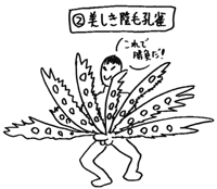 | 中出 | 「『ファック・ユー』といって中指を突きたてたので、 こちらは親指を人差し指と中指の間から グイッと出し手を振りました。 膜は閉じられ3億匹の友たちに永遠の別れを告げました。 苦しい戦いでした。 人には子宮回帰願望があるといわれますが、 そこに至るまでが黙示録でしたから、 私にはむしろ睾丸回帰願望がありますね」 |