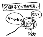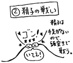 | 中出 | 「そこからはもう思い出したくないほどの修羅場です。 お互い殴る蹴る。 といっても精子には手足がないので 頭突きで戦うか、尻尾で打ったり 巻きつけて首をしめたりするしかありません」 |