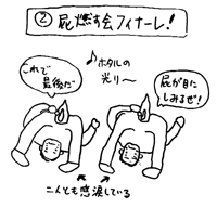 | S木 | 「そうなんだよ。最後だからビールで乾杯しながら、 イモとかニラとかいい屁のもとをたくさん食ったんだ。 そろそろしめようということになり、 三人は電気を消して屁を燃やす体勢をとった。 そしたらね、浜部っていうヤツが 蛍の光を歌いだしたんだ。 俺ともう一人も小さな声で口ずさんだ。 蛍の光に合わせて炎が飛び交う中、会は解散した。 でもね、これで屁から卒業かと思うと 悲しくなってきちゃってさ。 屁を燃やしながら俺、泣いちゃったんだよ。 横を見たら浜部も泣いていた。 今思うとかなりまぬけなんだけどね」 |
