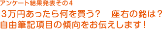 1位は、「寝る」! とにかく、余った時間は「寝る」! 2時間だろうと3時間だろうと「寝る」! 念のために注釈しますが、 「寝る」のなかには 「ねる」や「眠る」や「睡眠」など、 さまざまな「『寝る』っぽい表現」が含まれています。 そういったことを修正しつつ集計すると、 「寝る」が第1位! いやあ、そうですか。寝たいんだなあ、みんな。 考えてみると、ここにあるのは、 基本的には「できてないこと」なんですね。 やり足りないことも含めて。 もっと寝たいし、もっと本も読みたいし、 もっと運動したいし、もっと勉強したいし、 掃除もゲームも散歩も習い事もしたい。 みんな、そんなふうに思いながら、 過ごしているんですねー。 あと、ランク外のところで目にとまった答えとしては、 「瞑想」と答えた方が100人近くいらっしゃいました。 あと、「ウクレレの練習」は9名いらっしゃいました。 「中国拳法の練習」は2名でした。 ええと、ざーっと羅列してみましょうかね。 「お香を焚く」 「合コンして出会いを探す」 「本やで手裏剣術の本を見つけてからかれこれ8ヶ月くらい、 ダンボールに竹串を投げる日々が続いています。 その2時間で思うさま竹串を投げて練習したいです」 「合気道か、永久脱毛か」 「ガンプラづくり」 「いまマッサージのアルバイトをしていて たのしくてしょうがないので マッサージの練習をするかもしれません」 「手紙を書く。いまだにネット環境のない人がいるから」 「人が多いところに出て、うようよしている人間を観察」 「ペットと過ごす時間を増やしたい」 「何かをつくりたい。子どもの服、小物、編み物、お菓子、 手間のかかったご飯など。すごく何かをつくりたいです」 「おばあちゃんになっても たのしく続けられるなにかを見つけたい」 「4分の1をテレビに、残りを朝の長トイレに」 「パッチワークキルトをひたすら仕上げる」 「卓球の練習の日は、延長して練習したい」 「先月結婚したので、結婚式の写真を焼き増しして 来てくれたゲストに配ってスッキリしたい」 2時間という限られた時間のなかに、 いろんな人の「ちいさな理想や夢」が垣間みられて とても興味深かったです。 あと、「いつもやっていることを2時間分、丁寧にやる」 という答え方をしてくださる人も多かったです。 細かく書いていただき、どうもありがとうございました! さて、つぎの質問です。 「いま3万円あったら、何を買いますか?」 さあ、どんな結果になったのでしょうか。 こちらをご覧くださいませー。 【3万円ランキング】