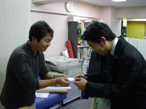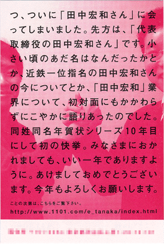 たがいのまわしを探りあうようなメールのやりとり! この時点でそうとうしびれましたね。 そして、ついに、 田中宏和さんと名刺交換を。 妙ちきりんな気分でしたねえ。 自分の人生を交換した気がしましたね。 話しているあいだじゅう、 ふたりともしげしげと先方の名刺を みていたことを思い出します。 手みやげがわりに インターネットの姓名判断の 占い結果を持参したのですが、 田中宏和はいい名前なんだと、 ふたりで喜びをわかちあいましたね。 もう名前馬鹿です。 「元近鉄とポケモンの田中宏和さんについて」 「小さい頃のあだなはなにでした?」 「自分の名前の漢字をひとにどう説明しているか?」 田中宏和同士でしか語り合えない ディープな情報交換を果たしてのでありました。 わたくしからは、 「社団法人田中宏和」の設立について提案しました。 田中宏和という名前の人だけの団体です。 みんなで同じ日に美容院の予約を入れてみるとか、 人数がまとまることでできる 活動があるのではないか。 もちろん田中姓の方には、 「子供ができたあかつきには 宏和でお願いします」と、 ひとりでも多く世界に田中宏和を増やしていく。 そんな『マトリックス』における ミスターアンダーソン的な 繁殖促進も視野に入れました。 そんなことを真剣に話しあい、 快活に笑いあった結果、 こんな年賀状ができました。 ![]() 取材に応じていただいた田中宏和さん、 毎年デザインをお願いしている植村倫明さん、 どうもありがとうございました。 こつこつ続けているといいことがあるもんですね。 ビジネスの世界もそうだとは思うんですが、 しみじみ、継続は力なり、です。 みなさまのこつこつに 幸多からんことをお祈りしつつ、 そんなこんなで今年もよろしくお願いします。 もちろん世界の田中宏和情報を |