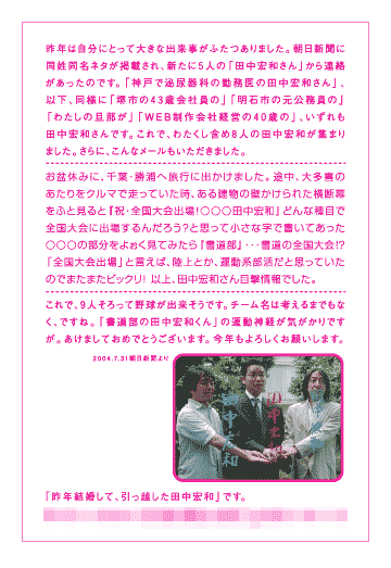 なんと献身的な田中宏和さん! 奔走の申し出をいただき、 恐縮であります。 田中宏和グループは人材が豊富だなあ。 以上7人の新情報をもちまして、 2005年の田中宏和年賀状ができたわけです。 ただ今年の年賀状化にあたって、 うっかり6人目の田中宏和さんの ご紹介を忘れておりました。 この場をお借りして、 陳謝でございます。 さらに、もう一人の田中宏和さん情報を 昨年の2月にいただいていたのを忘れていたんですよ。 もう田中宏和事務局が無いと、 まわらんです。とほ。