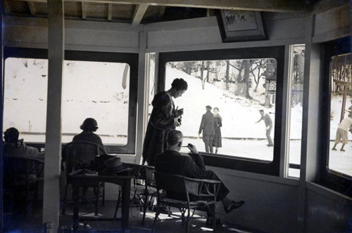 さて、日本にやってきた 外国人は、いったい どんなふうに 過ごしていたんでしょう。 こちらは金谷ホテルの 竜宮殿という建物から見た 庭のスケート場なんですけど、 やっぱりお客さんは 外国人の方が ほとんどなんですよね。