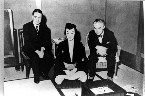 昭和初期、来日した 有名人のなかには、 チャップリンもいました。 5月14日に日本郵船北野丸で 神戸港に到着、 大歓迎を受け、 東京駅では8万人が チャップリンを迎えました。 帝国ホテルに宿泊、 5月15日大相撲見物、 18日に歌舞伎鑑賞。 演目は「仮名手本忠臣蔵」。 この写真は観劇後、 定九郎役の中村吉右衛門との スナップです。 箱根の富士屋ホテルに逗留、 6月4日に氷川丸で 帰国しました。